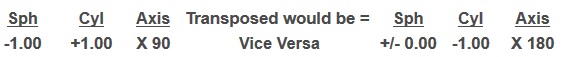 There are a couple different formats to interpret a cylinder reading. A minus (-) cylinder is most commonly written by Optometrist and has become an industry standard from dispensaries to labs. However, Ophthalmologists more often than not use a plus (+) cylinder reading when writing prescriptions. A prescription can generally look completely different, but yield the same visual results considering it is the same prescription, whether it is written as a plus (+) cylinder or minus (-) cylinder (see example below). There is actually a transposition formula (see formula below) to help interpret a prescription as a minus (-) or plus (+) cylinder prescription. Both yielding the same visual effect for a patient and technically both are the same prescription, but just prescribed as a plus or minus to accommodate the doctors preference.