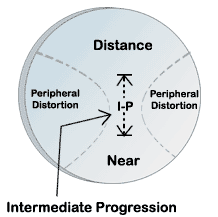 The progressive lens has a visual field anatomy of an hour glass (see image below). The two dominant prescriptions (distance and near) have a wider field of view. The progression in between has a narrow field of view leaving a peripheral distortion.
